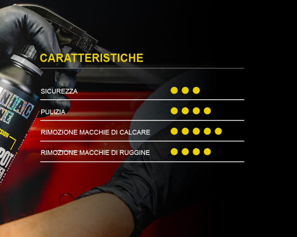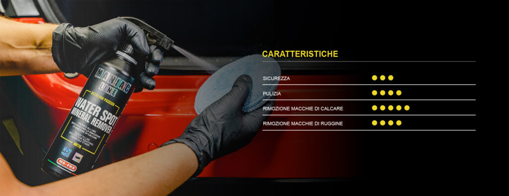 - In caso di macchie di calcare distribuite su tutta la carrozzeria, nebulizzare direttamente e omogeneamente il prodotto su un pannello per volta;