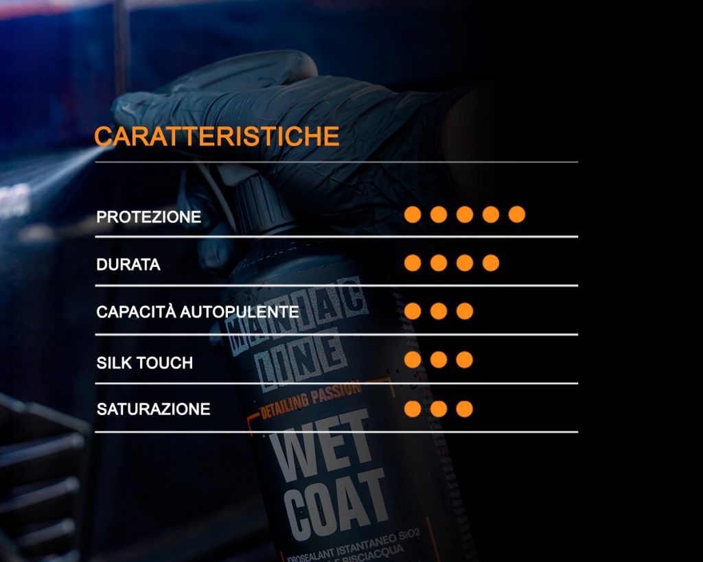 Wet Coat Maniac è il rivoluzionario trattamento spray che porta la protezione idrofobica e la lucentezza del veicolo a un livello superiore. Progettato come un protettivo wipeless, non richiede alcun passaggio con panni o spugne: basta spruzzarlo sull’auto bagnata dopo il lavaggio e risciacquare per attivare la sua azione protettiva.