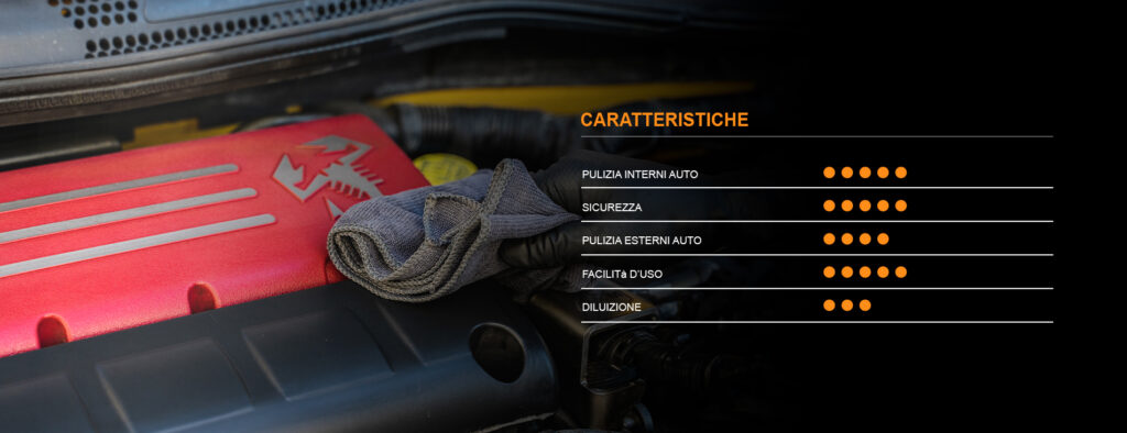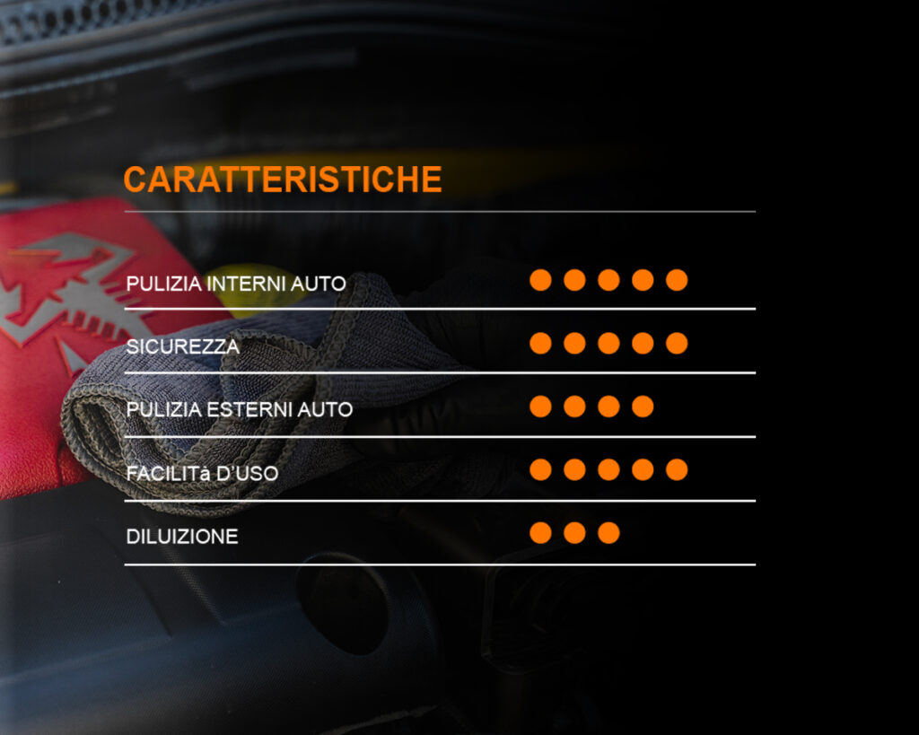 Questo prodotto si distingue per la sua ampia versatilità, essendo adatto sia agli interni che agli esterni dell'auto grazie alla sua efficacia su vari tipi di sporco e materiali. Offriamo consigli su diverse diluizioni a seconda dello sporco e del materiale interessato.