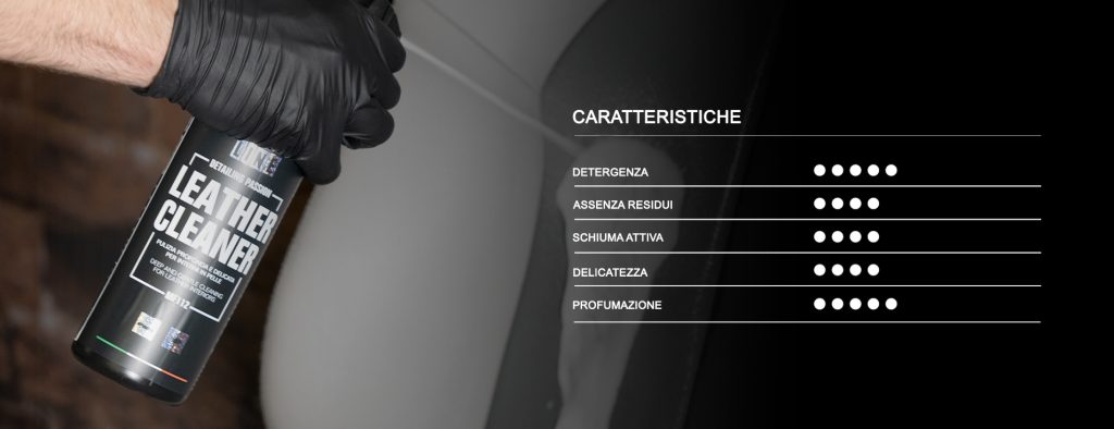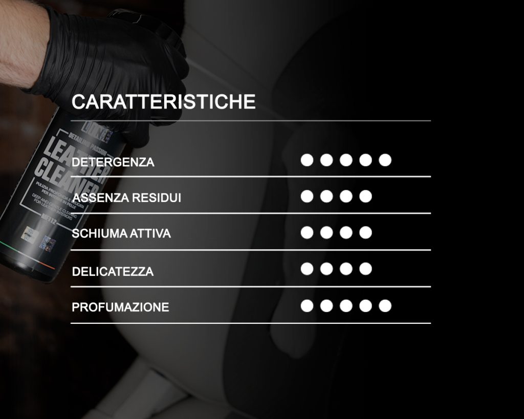 Leather Cleaner rimuove sporco, residui oleosi e polvere mantenendo inalterate texture, colore e finitura. È adatto a tutti i tipi di pelle: