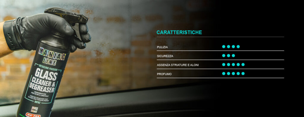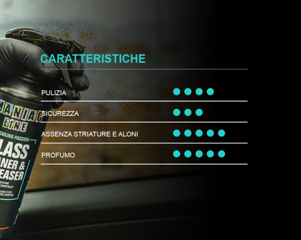 I prodotti casalinghi hanno un’azione pulente inferiore e soprattutto sono meno dedicati sulla molteplicità di materiali che possiamo trovare su un’automobile, spesso infatti questi prodotti utilizzano ammoniaca o alcool non raffinati: sostanze particolarmente dannose sui materiali specifici presenti all’esterno e soprattutto all’interno di un’automobile. Inoltre, Glass Cleaner & Degreaser conferisce un effetto oleofobico che riduce la formazione di impronte sulle superfici trattate, per questo particolarmente indicato per la pulizia dei touch screen.